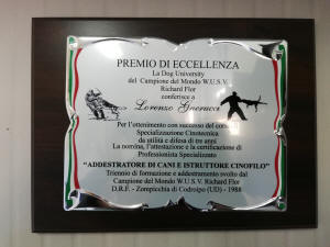 Caro Riccardo, il giorno che ci siamo conosciuti, e i cinque anni che ho passato al tuo fianco, sono stati i più importanti della mia vita, non solo per aver imparato da te un bagaglio cinotecnico enorme e professionale, ma anche perché sei stato il mio migliore amico e anche un secondo Padre! Tu mi hai insegnato certi valori della vita che al giorno d'oggi sono messi in secondo piano; ti sono stato accanto mentre gli allievi della "Dog University" prendevano le loro strade; eravamo talmente affiatati che io svolgevo nel tuo Centro Addestramento tutti i corsi dei proprietari iscritti e degli allievi iscritti, fino a diventare la tua spalla destra, che bel periodo.., faticoso ma stupendo, la mole di lavoro mi portava a svolgere una media di 50 cani al giorno, sotto la tua supervisione e non.., ci siamo proprio divertiti vero? Spero che in questo momento puoi sentire un brivido di felicità ripensando ai vecchi tempi.., e ricordati che io Lorenzo, sono forse l'unico che ancora oggi sento un grande rispetto, gran dedizione, e una grandissima nostalgia nei tuoi confronti! Grazie a te e ai tuoi insegnamenti ho potuto realizzare il mio sogno, quello di aprire una mia Scuola la "Dog City" nata nel 1988 a Roma, ed ancora oggi rispettata per la sua alta professionalità cinotecnica, dove il suo fondatore e addestratore "Lorenzo Gnerucci" porta avanti le tue metodologie addestrative ancor più specifiche e professionali vista la grande esperienza maturata con l'impegno svolto sul territorio Romano, che ha portato un numero elevatissimo di corsi di addestramento svolti "2500 cani addestrati con i loro relativi proprietari" già nel 1998, direi un ottimo successo..